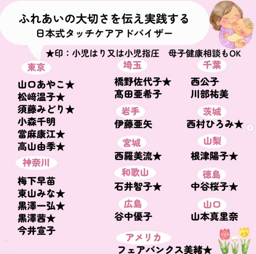 メンバーは日本古来から続いている、子どもの心身を育てる「小児あん摩」(今でいうべビーマッサージ)を元にしたオイルを使用しないベビーマッサージの基礎を学んだうえで、会の活動や地域での活動を通して、「ふれる」ことの大切さを学び続け、地域の親子さんにふれあいの実践方法をお伝えしています。